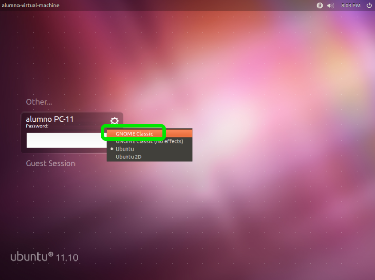 Para poder utilizar GNOME, pulsamos la herramienta que hay al lado de nuestro nombre de usuario, y seleccionamos la opción GNOME Classic: